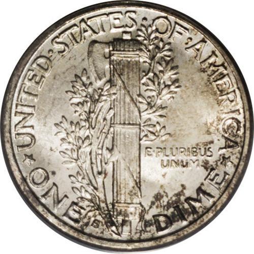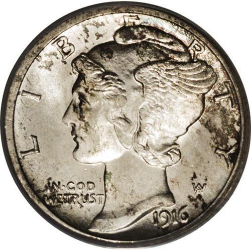 <B>1916-S<10C> MS67 Full Bands PCGS.</B></I> Ex: Larry Shapiro. Liberty's cheek, forehead, wings, and upper cap sport a halo of mottled russet, aqua, and deep-gray toning, with a lightly toned golden-gray reverse. Essentially perfect surfaces. The devices are strongly defined throughout, except for the lower diagonal band, which is almost always a tad soft. The mintmark is placed high in relation to later issues, as often seen on this date. One of the few graded so fine. Population: 10 in 67, 0 finer (4/06).
