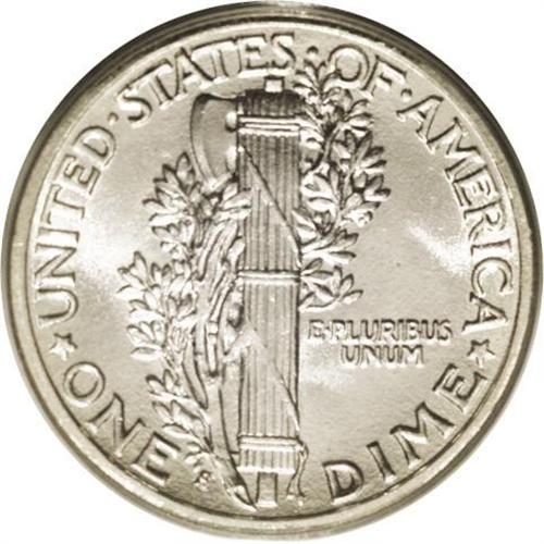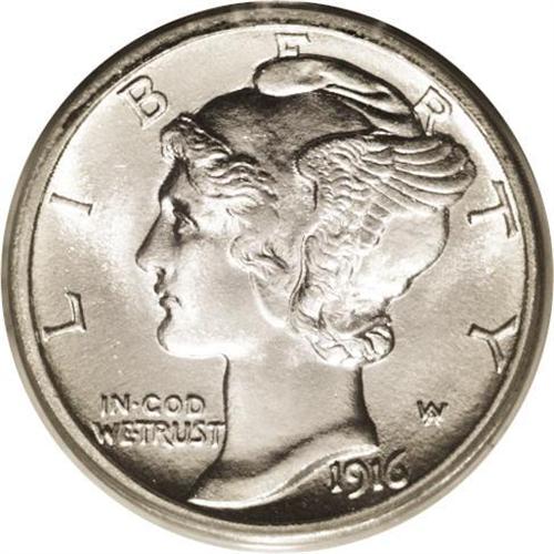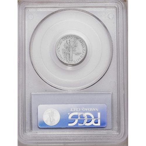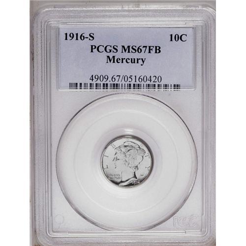 <B>1916-S<10C> MS67 Full Bands PCGS.</B></I> The famous 1916-D gets all the glory, but the 1916-S is also significantly rare at the MS67 level, probably because mint rolls were not generally set aside until the thirties. This lustrous and stone-white Superb Gem is essentially immaculate, and the strike is full save for the top of the lower diagonal fasces band. The all-important central bands are needle-sharp. NGC and PCGS combined have graded 12 pieces as MS67 Full Bands (5/06) with none finer.