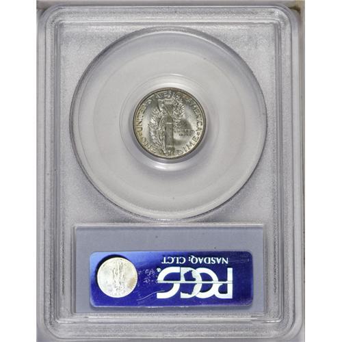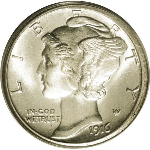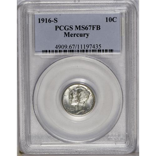<B>1916-S<10C> MS67 Full Bands PCGS.</B></I> This issue is characterized by strike weakness in the central parts of both sides. It is refreshing, therefore, when we are greeted with a sharply struck example such as the one offered here. In addition to fully split bands, Mercury's feather and hair detail are well defined. The only area of softness is on the upper half of the lower diagonal band, which is typical for the date. The only toning visible on the radiantly lustrous surfaces occurs along the reverse borders, and is a light milky-tan. Both sides are impeccably preserved. Population: 11 in 67 Full Bands, 0 finer (6/06).