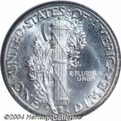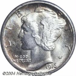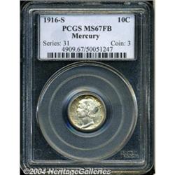 <B>1916-S<10C> MS67 Full Bands PCGS.</B></I> Attractive golden color adds an original touch to this coin's obverse, the reverse is bright and untoned. It is boldly struck throughout, with the all-important Full Bands definition readily evident. While common in circulated and lower Mint State grades, the 1916-S is rare at the present level of preservation. The San Francisco Mint cranked out nearly six million pieces of the final-year Barber Dime issue, and proceeded to strike more than 10 million examples of the new Mercury design. Their high level of productivity resulted in only average sharpness on many Mint State survivors, making this coin a rare exception to the rule. Only eight pieces have been graded at MS67, with Full Bands, by both of the major services combined, and none have been certified any finer (7/04). <BR><BR><B>Important notice:</B> Heritage usually auctions material at the rate of 200-250 lots per hour. On some occasions eBay Live bid software or the Internet may not be able to keep up with the pace of the auction. We recommend placing a realistic absentee bid now as insurance to avoid disappointment. Occasionally the auctioneer may eliminate or reject an eBay Live bid, and the auctioneer may also reopen a lot after the close of the eBay live bidding (usually because we missed an audience bid), and may reject your bid even if it shows you as the winning bidder. By bidding via eBay Live, you agree that Heritage may award the lot to another bidder at its sole discretion under the circumstances described above or any other reasonable circumstances. Since eBay bids are not shown to us until we open the lot on the floor, we treat those bids just like floor bids. In most cases the floor responds before the eBay bid is presented to us, due to Internet lag time, so for consistency we have made it a policy that floor bids are always considered first over tie eBay live bids. Also please note that all Heritage lots purchased through eBay Live carry a 20% Buyer's Premium. Please make sure you read the Terms and Conditions before you bid. </span></font></tr></table></td></tr></table>