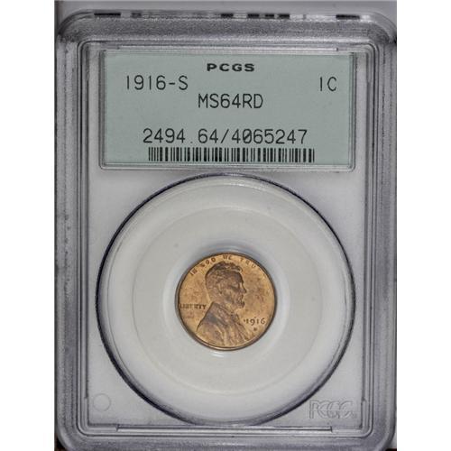 <B>1916-S<1C> MS64 Red PCGS.</B></I> Deceptively rare with full red color. Light copper-orange obverse toning and orange to green reverse colors make this piece appealing. Only a few small ticks, and one noticeable abrasion on Lincoln's cheek, keep this piece from Gem status.