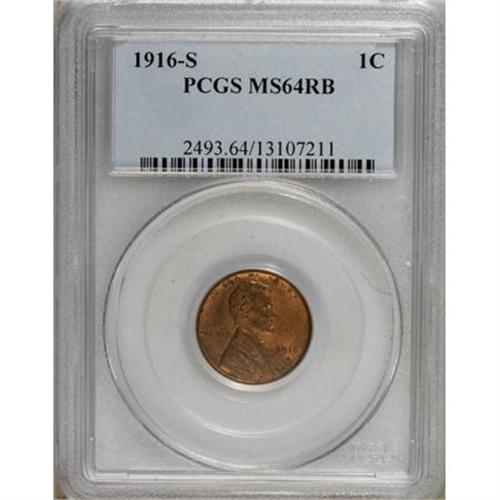 <B>1916-S 1C MS64 Red and Brown PCGS.</B></I> PCGS Population (130/25). NGC Census: (93/51). Mintage: 22,510,000. Numismedia Wsl. Price for NGC/PCGS coin in MS64: $272. (#2493)<BR><BR><b>Shipping:</b> Coins & Currency (<a target="_blank" href="http://www.heritageauctions.com/common/shipping.php">view shipping information</a>)