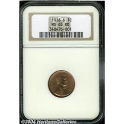 <B>1916-S<1C> MS65 Red NGC.</B></I> An increase in production at the San Francisco Mint to more than 22 million pieces has no ill-effect on the issue's scarcity at the Gem level. The strike on this outstanding representative is razor sharp and bright golden-pink surfaces have only a few microscopic freckles of carbon here and there. Population: 5 in 65, 1 finer (7/04). <BR><BR><B>Important notice:</B> Heritage usually auctions material at the rate of 200-250 lots per hour. On some occasions eBay Live bid software or the Internet may not be able to keep up with the pace of the auction. We recommend placing a realistic absentee bid now as insurance to avoid disappointment. Occasionally the auctioneer may eliminate or reject an eBay Live bid, and the auctioneer may also reopen a lot after the close of the eBay live bidding (usually because we missed an audience bid), and may reject your bid even if it shows you as the winning bidder. By bidding via eBay Live, you agree that Heritage may award the lot to another bidder at its sole discretion under the circumstances described above or any other reasonable circumstances. Since eBay bids are not shown to us until we open the lot on the floor, we treat those bids just like floor bids. In most cases the floor responds before the eBay bid is presented to us, due to Internet lag time, so for consistency we have made it a policy that floor bids are always considered first over tie eBay live bids. Also please note that all Heritage lots purchased through eBay Live carry a 20% Buyer's Premium. Please make sure you read the Terms and Conditions before you bid. </span></font></tr></table></td></tr></table>