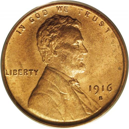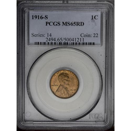 <B>1916-S<1C> MS65 Red PCGS.</B></I> Another sharply struck early Lincoln cent that has bold definition on Lincoln's beard, hair and the motto, areas that are frequently softly impressed. The surfaces are free of distracting spots or surface abrasions, and a strong loupe is needed to find the minute signs of contact. Identifiable by a short planchet flaw below Lincoln's temple and a speck at the top of EN of CENT. To date a mere 22 pieces have been graded this high, <I>with none seen finer by PCGS.</B></I><BR><I>From The Kendall Marie #4 All-Time Finest PCGS Registry of Lincoln Cents with Varieties, Circulation Strikes, 1909-1958.</B></I> <BR><BR><B>Important notice:</B> Heritage usually auctions material at the rate of 200-250 lots per hour. On some occasions eBay Live bid software or the Internet may not be able to keep up with the pace of the auction. We recommend placing a realistic absentee bid now as insurance to avoid disappointment. Occasionally the auctioneer may eliminate or reject an eBay Live bid, and the auctioneer may also reopen a lot after the close of the eBay live bidding (usually because we missed an audience bid), and may reject your bid even if it shows you as the winning bidder. By bidding via eBay Live, you agree that Heritage may award the lot to another bidder at its sole discretion under the circumstances described above or any other reasonable circumstances. Since eBay bids are not shown to us until we open the lot on the floor, we treat those bids just like floor bids. In most cases the floor responds before the eBay bid is presented to us, due to Internet lag time, so for consistency we have made it a policy that floor bids are always considered first over tie eBay live bids. Also please note that all Heritage lots purchased through eBay Live carry a 20% Buyer's Premium. Please make sure you read the Terms and Conditions before you bid. This lot is being auctioned in conjunction with a live floor auction by Heritage Galleries & Auctioneers. All final auction and invoice information will be supplied by Heritage Galleries & Auctioneers, and all other information should be considered preliminary. Lot:489 <BR><BR><B>Winning Notification and Billing:</B> After the FINAL session in this auction is complete, Heritage will send e-mail and snail mail invoices. This process normally takes several days. All final auction and invoice information will be supplied by Heritage Galleries & Auctioneers, and all other information should be considered preliminary. <BR><BR>This auction will be conducted on a live auction floor and over the Internet through eBay Live. If you choose to place an absentee bid, please take a moment to <font color='#0000ff'><u><a href='http://pages.ebay.com/liveauctions/help/before/laabsentee.html'>learn how eBay Live absentee bidding works</a></u></font><font color='#000000'>