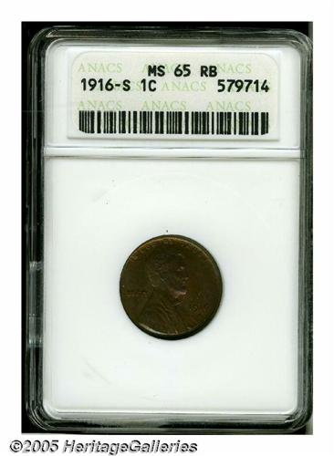 <B>1916-S<1C> MS65 Red and Brown ANACS.</B></I> Beautifully toned in violet, electric-blue, orange, and olive colors invigorate this lustrous and sharply struck Gem. A lovely example of this scarce branch mint issue.