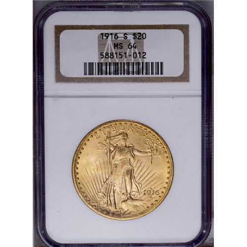 1916-S $20 MS64 NGC. Generally well struck, if a trifl 1916-S[$20] MS64 NGC.