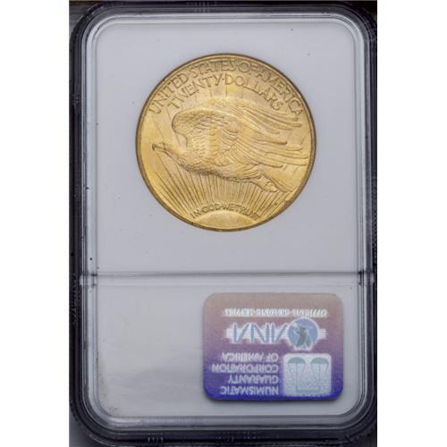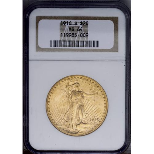 <B>1916-S<$20> MS64 NGC.</B></I> Lustrous and well struck with a few minor scrapes and abrasions on the obverse that keep it from being graded as a Gem. Attractive reddish-golden color enhances the eye appeal of the piece.