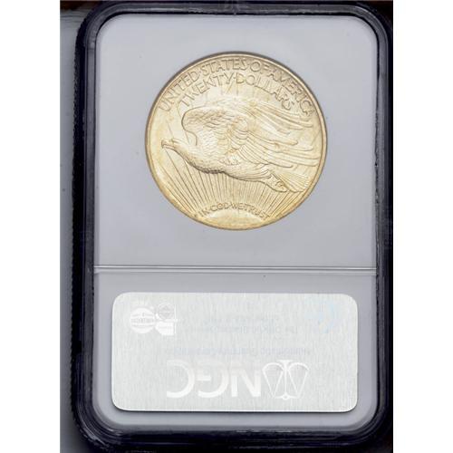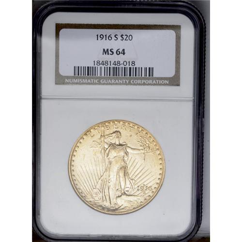 <B>1916-S<$20> MS64 NGC.</B></I> Vibrant luster radiates from brassy-gold surfaces that contain a few dapples of deeper orange-gold, and the design features are well impressed. Some minute obverse marks, and luster grazes in the field above the eagle, prevent a higher grade.