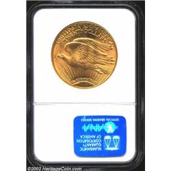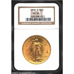 1916-S $20 MS64 NGC. Warmly frosted with splendid golden-rose coloration, both sides are free of all but one or two wispy abrasions. There is a mentionable spot in the lower right obverse field. Important notice: We expect to be auctioning lots at the rate of 200-250 per hour. Sometimes eBay Premier live bid software cannot keep up with that pace, so we strongly recommend that you place a realistic proxy bid now as insurance to avoid disappointment. Also please note that all Heritage/CAA lots purchased through eBay Premier carry a 20% Buyer's Premium. Please make sure you read the Terms and Conditions.