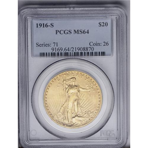 <B>1916-S<$20> MS64 PCGS.</B></I> A delightful near-Gem example of this available issue, with amber-gold, lustrous surfaces and a few undistracting abrasions that define the grade.