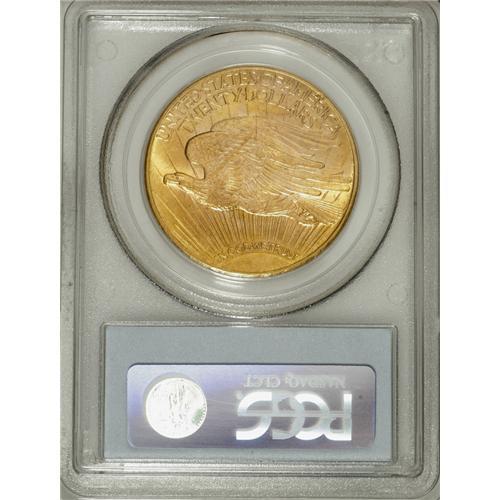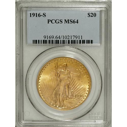 <B>1916-S $20 MS64 PCGS.</B></I> A flashy orange-gold example with glints of canary-yellow in the fields. A solidly struck near-Gem example of this wartime issue, which remained elusive until the discovery of a sizable hoard in South America.<BR><BR><b>Shipping:</b> Coins & Currency (<a target="_blank" href="http://www.heritageauctions.com/common/shipping.php">view shipping information</a>)