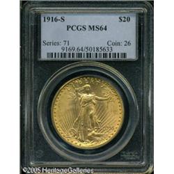 <B>1916-S $20 MS64 PCGS.</B></I> A fully struck example of this popular S-mint twenty from the teens. Light, even coloration. Lot:9589