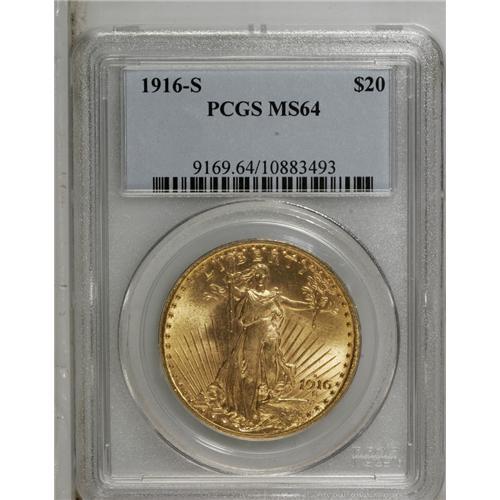 <B>1916-S $20 MS64 PCGS.</B></I> A highly lustrous and slightly frosty near-Gem that has pleasing luster and nicely struck devices. If not for some minor abrasions in the fields, this piece would have the eye appeal of a higher grade.<BR><BR><b>Shipping:</b> Coin/Currency (<a target="_blank" href="http://www.heritageauctions.com/common/shipping.php">view shipping information</a>)