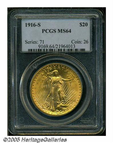 <B>1916-S<$20> MS64 PCGS.</B></I> Deep honey-gold color tending toward orange. The surfaces have frosty luster and the overall eye appeal is excellent. A wonderful example representing the only Double Eagle coinage of the year.