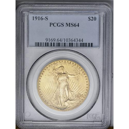 <B>1916-S<$20> MS64 PCGS.</B></I> Only a few small surface marks keep this from a Gem grade assignment. The surfaces are fully brilliant with frosty yellow luster. A delightful example.