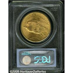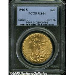 <B>1916-S $20 MS64 PCGS.</B></I> Peach-gold patination embraces lustrous surfaces that are well struck. The grade is limited by a few minute marks over each side, none of which are singularly bothersome.