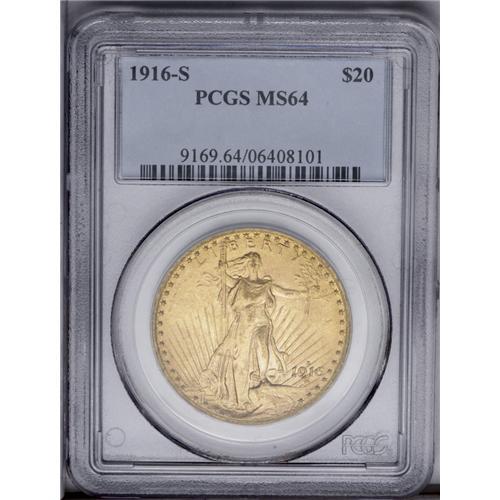 1916-S $20 MS64 PCGS. The soft, frosted mint luster is 1916-S[$20] MS64 PCGS.
