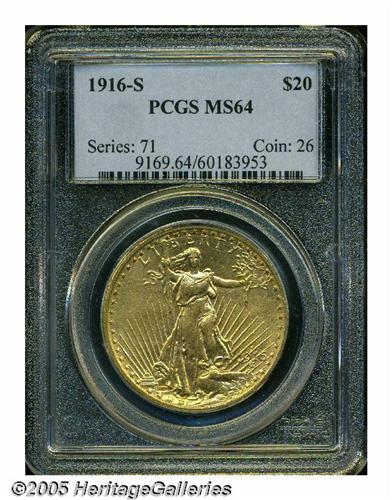 <B>1916-S<$20> MS64 PCGS.</B></I> This '16-S displays pebbly-like, peach-gold surfaces that radiate great luster, and sharply impressed motifs. A couple of trivial marks occur in the left (facing) obverse field, and another on Liberty's right breast.