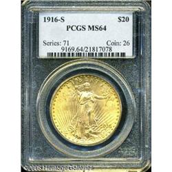 <B>1916-S $20 MS64 PCGS.</B></I> This is a lovely Choice Mint State example with brilliant yellow-gold surfaces and frosty luster. Lot:9591