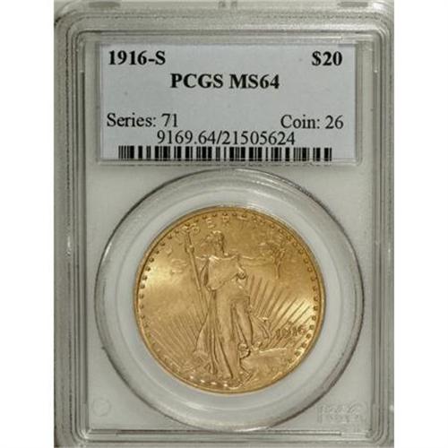 <B>1916-S $20 MS64 PCGS.</B></I> This highly lustrous near-Gem exhibits exquisite strike definition, especially on Liberty's face, fingers, and toes, and on the panes of the Capitol building. Pretty apricot-gold color adorns both faces.<BR><BR><b>Shipping:</b> Coins & Currency (<a target="_blank" href="http://www.heritageauctions.com/common/shipping.php">view shipping information</a>)