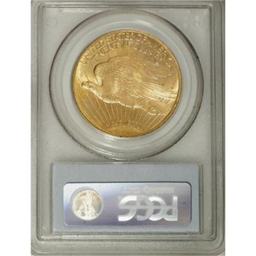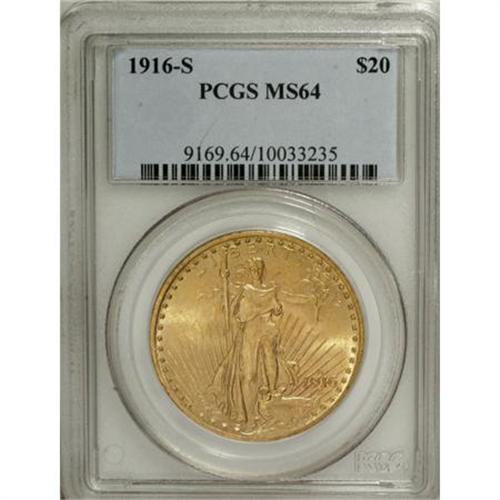 <B>1916-S $20 MS64 PCGS.</B></I> Apricot-gold surfaces exhibit sharply defined motifs and pleasing luster. A few minute contact marks limit the grade. This issue was scarce until a hoard of 4,000 pieces was discovered in South America (Jeff Garrett and Ron Guth, 2006)<BR><BR><b>Shipping:</b> Coins & Currency (<a target="_blank" href="http://www.heritageauctions.com/common/shipping.php">view shipping information</a>)