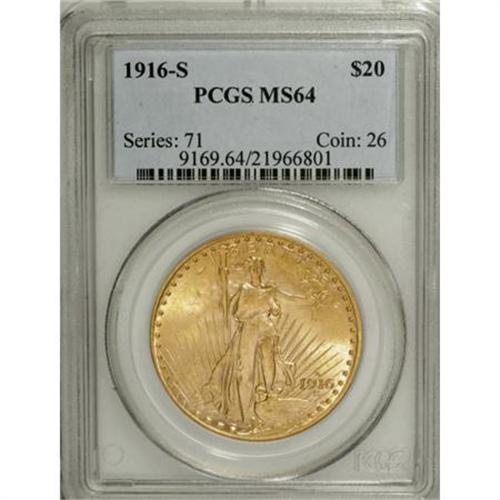 <B>1916-S $20 MS64 PCGS.</B></I> PCGS Population (1281/1050). NGC Census: (1399/975). Mintage: 796,000. Numismedia Wsl. Price for NGC/PCGS coin in MS64: $1,100. (#9169)<BR><BR><B>Coin Engraver:</B> Augustus Saint-Gaudens<BR><BR><b>Shipping:</b> Coins & Currency (<a target="_blank" href="http://www.heritageauctions.com/common/shipping.php">view shipping information</a>\)