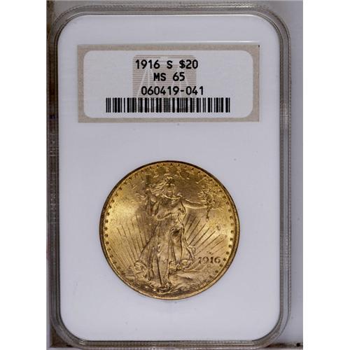 <B>1916-S<$20> MS65 NGC.</B></I> One of the more available mintmarked S-mint Saint-Gaudens issues, along with the 1914-S and 1915-S. The satiny surfaces are copper-gold, with a slightly hazy gray-gold overlay. Remarkably abrasion-free, even with a glass, and well struck, as often on this issue. Appealing! There are 99 finer at NGC (3/06). <BR><BR><B>Important notice:</B> Heritage usually auctions material at the rate of 200-250 lots per hour. On some occasions eBay Live bid software or the Internet may not be able to keep up with the pace of the auction. We recommend placing a realistic absentee bid now as insurance to avoid disappointment. Occasionally the auctioneer may eliminate or reject an eBay Live bid, and the auctioneer may also reopen a lot after the close of the eBay live bidding (usually because we missed an audience bid), and may reject your bid even if it shows you as the winning bidder. By bidding via eBay Live, you agree that Heritage may award the lot to another bidder at its sole discretion under the circumstances described above or any other reasonable circumstances. Since eBay bids are not shown to us until we open the lot on the floor, we treat those bids just like floor bids. In most cases the floor responds before the eBay bid is presented to us, due to Internet lag time, so for consistency we have made it a policy that floor bids are always considered first over tie eBay live bids. Also please note that all Heritage lots purchased through eBay Live carry a 20% Buyer's Premium. Please make sure you read the Terms and Conditions before you bid. This lot is being auctioned in conjunction with a live floor auction by Heritage Galleries & Auctioneers. All final auction and invoice information will be supplied by Heritage Galleries & Auctioneers, and all other information should be considered preliminary. Lot:4657 <BR><BR><B>Winning Notification and Billing:</B> After the FINAL session in this auction is complete, Heritage will send e-mail and snail mail invoices. This process normally takes several days. All final auction and invoice information will be supplied by Heritage Galleries & Auctioneers, and all other information should be considered preliminary. <BR><BR>This auction will be conducted on a live auction floor and over the Internet through eBay Live. If you choose to place an absentee bid, please take a moment to <font color='#0000ff'><u><a href='http://pages.ebay.com/liveauctions/help/before/laabsentee.html'>learn how eBay Live absentee bidding works</a></u></font><font color='#000000'>