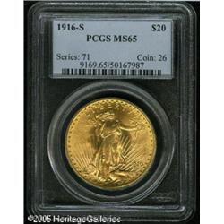 <B>1916-S $20 MS65 PCGS.</B></I> Highly lustrous with brilliant golden surfaces and excellent eye appeal. This is a delightful example that will certainly please most collectors. Lot:9593
