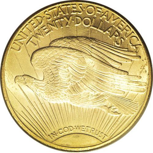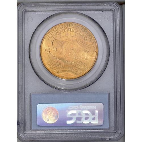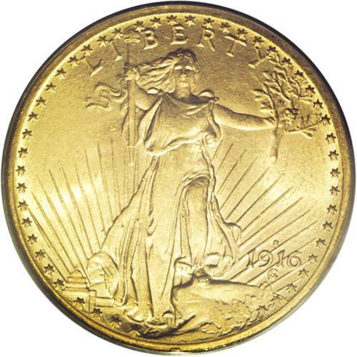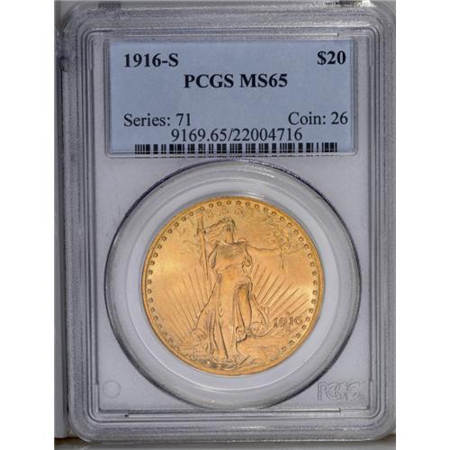 <B>1916-S<$20> MS65 PCGS.</B></I> Liberty's face and the Capitol building are intricately defined, and the eagle's breast and leg possess an equally sharp strike. Vibrant luster illuminates clean fields and devices. A tiny obverse rim nick at 6 o'clock is barely worthy of individual mention.
