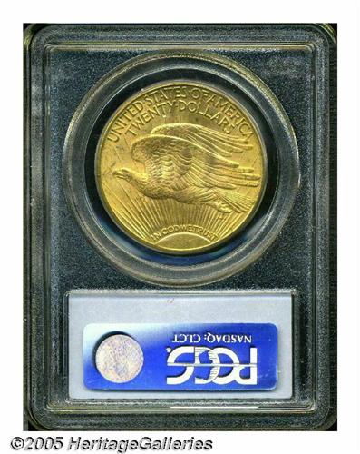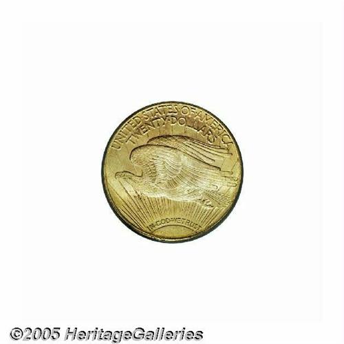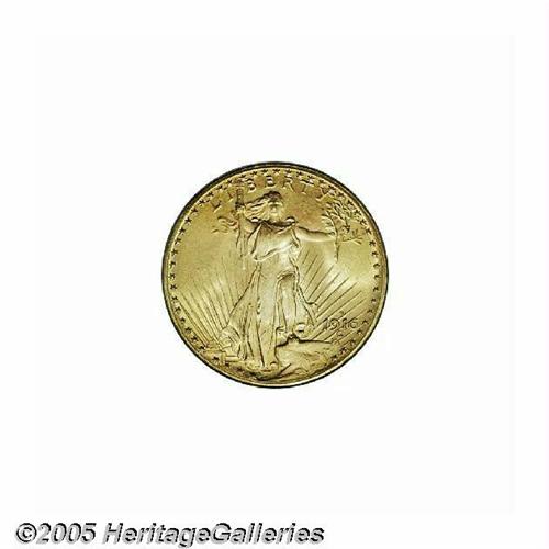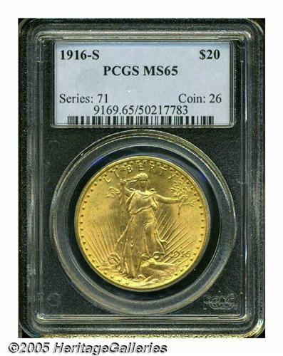 <B>1916-S<$20> MS65 PCGS.</B></I> This Gem is boldly struck and has a number of strictly superficial, wispy little contact marks on either side. Splendid bright orange color helps to generate exceptional eye appeal.