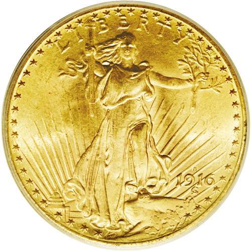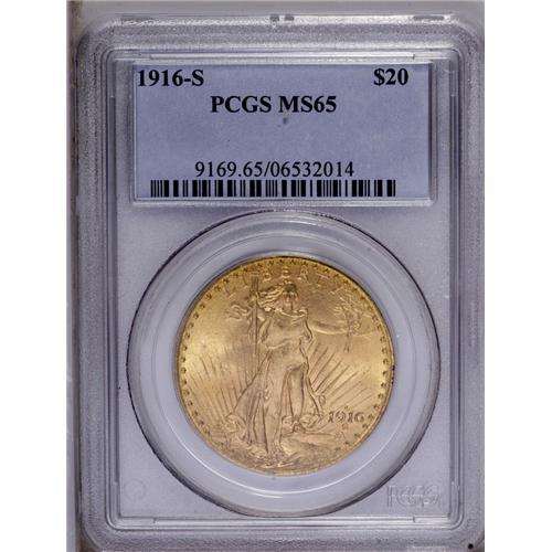 <B>1916-S<$20> MS65 PCGS.</B></I> This boldly struck Gem exhibits superb mint luster with very clean fields and a few light abrasions on each side. Attractive color with mostly reddish-golden patina on each side. Fewer than 800,000 double eagles were struck in 1916, all at the San Francisco Mint.