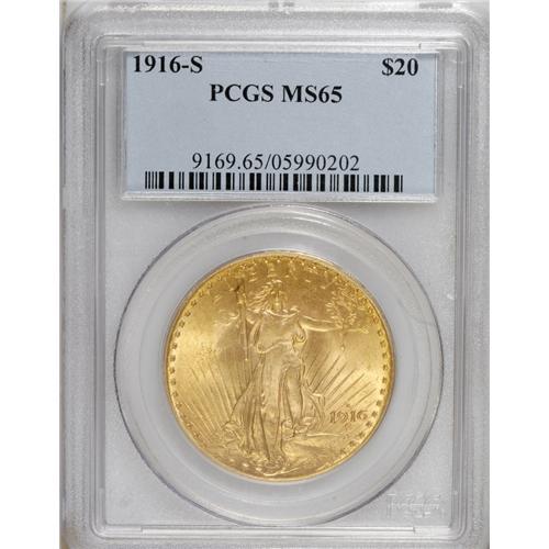 <B>1916-S $20 MS65 PCGS.</B></I> This highly lustrous wheat-gold Gem has a solid strike, and the well-preserved fields host equally clean devices. While the double eagle was a workhorse denomination for international commerce, the world was troubled, and this would be the last issue of the denomination until the Great War ceased.<BR><BR><b>Shipping:</b> Coins & Currency (<a target="_blank" href="http://www.heritageauctions.com/common/shipping.php">view shipping information</a>)