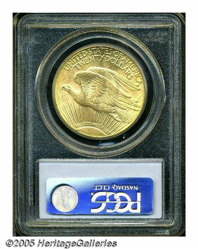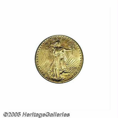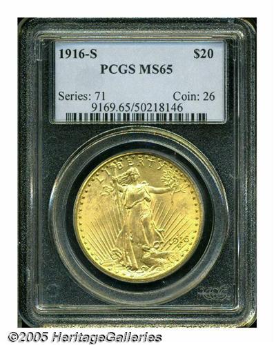 <B>1916-S<$20> MS65 PCGS.</B></I> Well struck with shimmering, softly frosted luster, beautiful light coloration, and a handful of blemishes on each side of the coin, none of which seem out of context for a Gem.