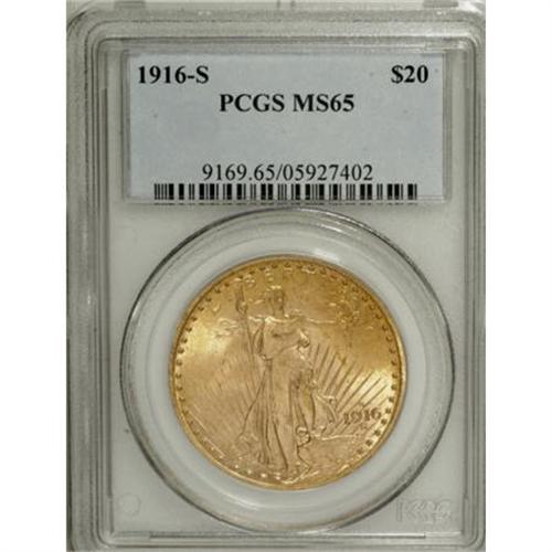 <B>1916-S $20 MS65 PCGS.</B></I> Peach-gold surfaces reveal traces of apricot, and emit radiant luster. Sharply struck, with just a few minute marks.<BR><BR><b>Shipping:</b> Coins & Currency (<a target="_blank" href="http://www.heritageauctions.com/common/shipping.php">view shipping information</a>)