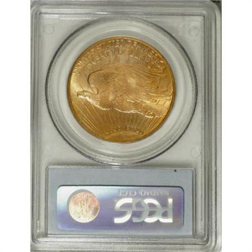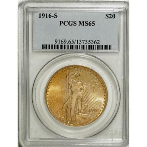 <B>1916-S $20 MS65 PCGS.</B></I> Beautiful, soft mint frost illuminates the matte-like surfaces of this Gem double eagle. Variegated coppery-orange and steel-green toning increases the coin's eye appeal. Few marks are observed on either side of this attractive piece. <BR><I>From The Mario Eller Collection, Part Two.</B></I><BR><BR><B>Coin Engraver:</B> Augustus Saint-Gaudens<BR><BR><b>Shipping:</b> Coins & Currency (<a target="_blank" href="http://www.heritageauctions.com/common/shipping.php">view shipping information</a>)