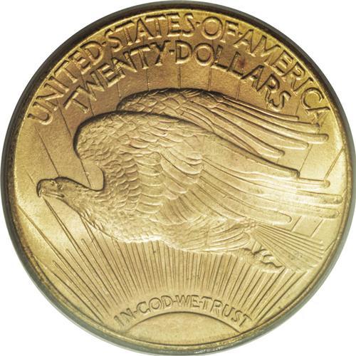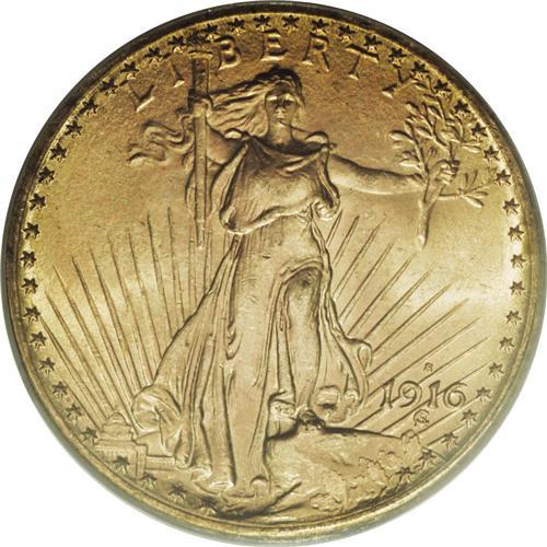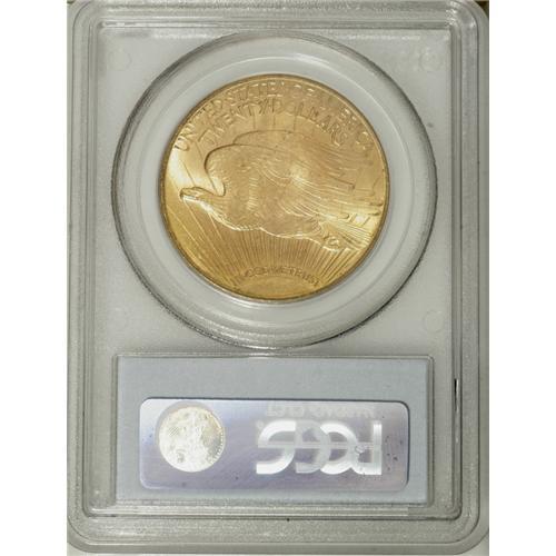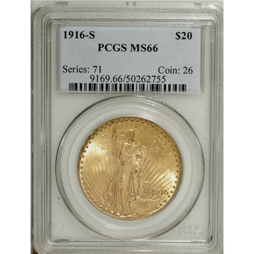 <B>1916-S $20 MS66 PCGS.</B></I> A remarkably preserved example with frosty orange-gold luster and excellent eye appeal. The surfaces have the usual orange-peel texture associated with this issue. A luster graze is visible on Liberty's knee, the most noticeable evidence of contact.<BR><BR><b>Shipping:</b> Coin/Currency (<a target="_blank" href="http://www.heritageauctions.com/common/shipping.php">view shipping information</a>)