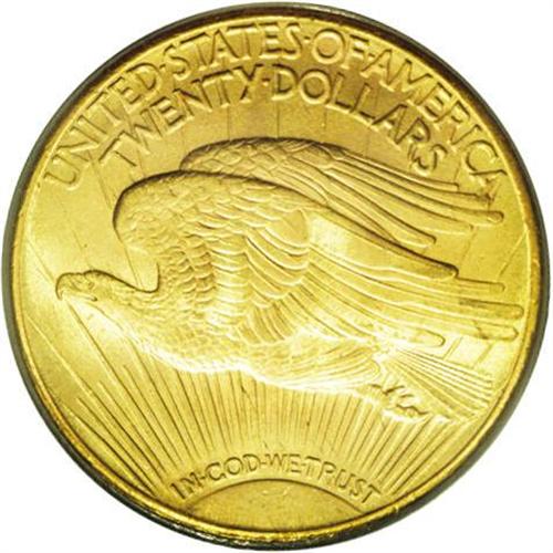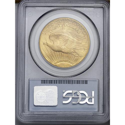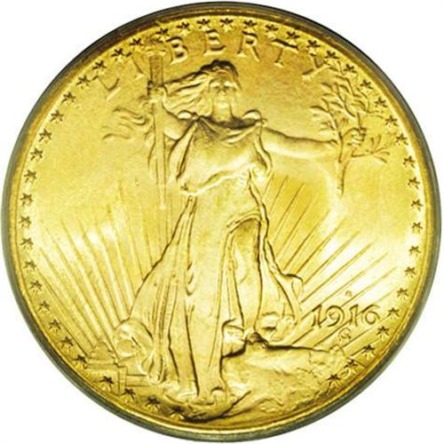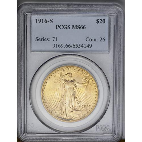 <B>1916-S<$20> MS66 PCGS.</B></I> Although common in all Mint State grades, and available--for a price--up to MS65, higher-graded examples such as this Premium Gem are elusive. The lustrous surfaces are a combination of satiny and frosty, with orange-gold color. None of the few abrasions visible under a loupe are bothersome. One of the finest graded at PCGS (6/06).