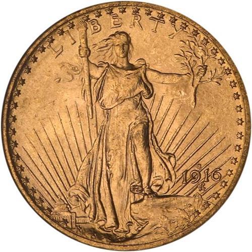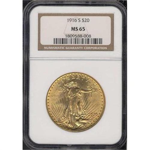 <b>1916-S $20 St. Gaudens. NGC graded MS65.</b> NGC Pop: 766. Another exciting Gem quality coin that will be a favorite of bidders. Bright orange-gold surfaces with a change to more subtle natural reddish tinted gold (from the 10% copper hardening alloy in the coin).