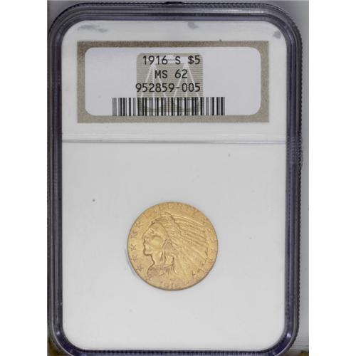 <B>1916-S<$5> MS 62 NGC.</B></I> A reddish-gold example with lustrous, somewhat matte-like surfaces, moderate abrasions, and a sharp strike. Quite pleasing for the grade, and scarce any finer.