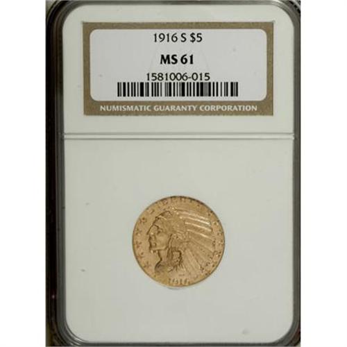 <B>1916-S $5 MS61 NGC.</B></I> A boldly impressed and slightly brassy example of the penultimate half eagle issue intended for circulation. Though the piece has a clean appearance at arm's length, closer inspection reveals a number of wispy, grade-defining abrasions.<BR><BR><B>Coin Engraver:</B> Bela Lyon Pratt<BR><BR><b>Shipping:</b> Coins & Currency (<a target="_blank" href="http://www.heritageauctions.com/common/shipping.php">view shipping information</a>)