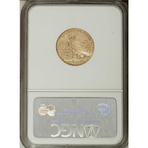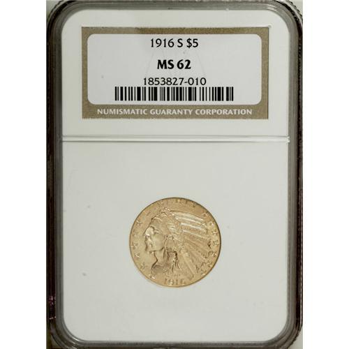 <B>1916-S $5 MS62 NGC.</B></I> The luster is satiny, but the strike is unusually strong, as is the eye appeal. Light abrasions that affect the Indian's jaw and the fields account for the grade.<BR><BR><b>Shipping:</b> Coin/Currency (<a target="_blank" href="http://www.heritageauctions.com/common/shipping.php">view shipping information</a>)