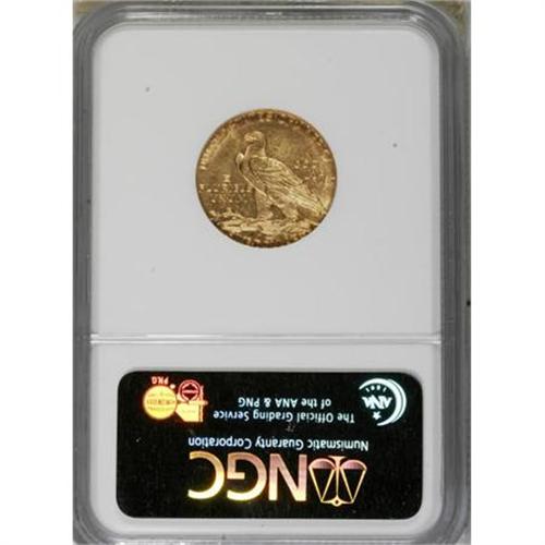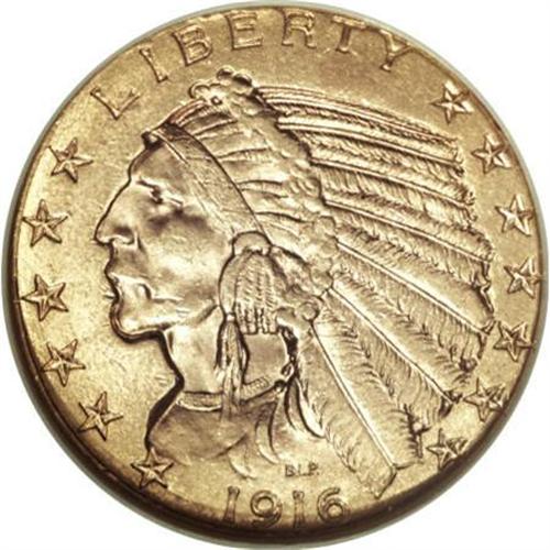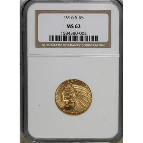 <B>1916-S $5 MS62 NGC.</B></I> A boldly impressed, strongly lustrous example of this penultimate classic gold half eagle issue, primarily yellow-gold with strong elements of peach and orange on the obverse. Excellent overall visual appeal despite a handful of light to moderate abrasions that appear to the left of the Indian's profile and on the cheek.<BR><BR><B>Coin Engraver:</B> Bela Lyon Pratt<BR><BR><b>Shipping:</b> Coins & Currency (<a target="_blank" href="http://www.heritageauctions.com/common/shipping.php">view shipping information</a>)