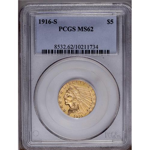 <B>1916-S<$5> MS62 PCGS.</B></I> Satiny and vibrant with attractive toning and bold details. Wispy marks are scattered over the reverse. Flatness on the sides of the eagle's neck may be the result of excess die polish. The mintmark is mushy.