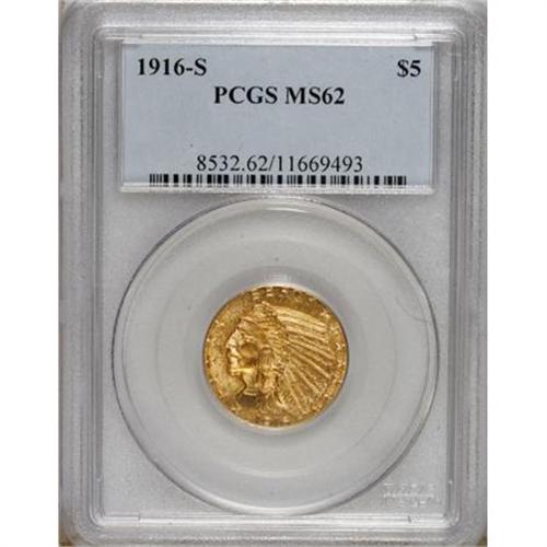 <B>1916-S $5 MS62 PCGS.</B></I> After the 1916-S half eagle issue, 90 years would pass before San Francisco struck the denomination again. This well-defined piece has lightly abraded yellow-orange surfaces that display above-average luster. A few tiny copper spots are noted at the upper right reverse.<BR><BR><b>Shipping:</b> Coins & Currency (<a target="_blank" href="http://www.heritageauctions.com/common/shipping.php">view shipping information</a>)