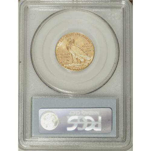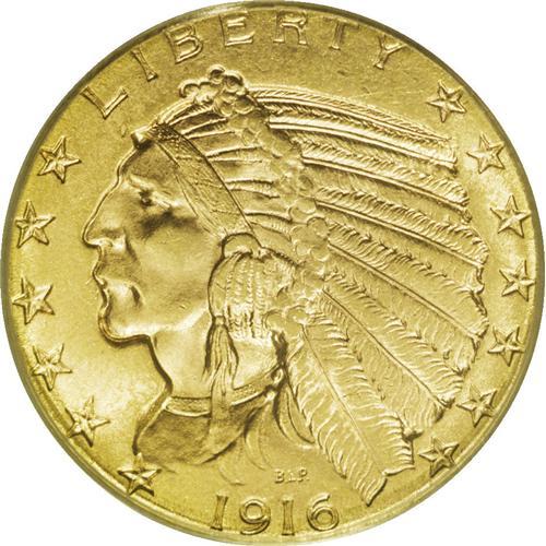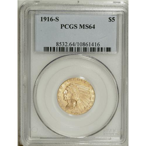 <B>1916-S $5 MS64 PCGS.</B></I> This relatively high-mintage (240,000 pieces) half eagle is scarce in the lower and middle Mint State grades, and very scarce in near-Gem. Specimens in higher levels of preservation are quite difficult to locate. This near-Gem displays bright peach-gold surfaces and pleasing luster. The design elements are crisply impressed, and reveal sharp definition in the headdress feathers as well as those on the eagle, including the bird's shoulder. Close examination displays no marks worthy of individual mention. Population: 67 in 64, 11 finer (10/06).<BR><BR><b>Shipping:</b> Coin/Currency (<a target="_blank" href="http://www.heritageauctions.com/common/shipping.php">view shipping information</a>)