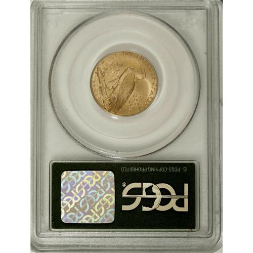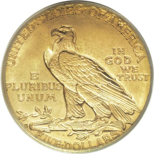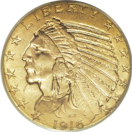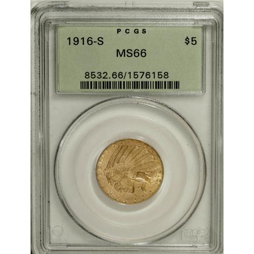 <B>1916-S $5 MS66 PCGS.</B></I> This coin is a virtual grading lesson in itself, providing a sharpness that is startlingly well detailed, and giving the leisurely viewer an opportunity to appreciate the many fine details that are weak or altogether lacking on lesser coins. For starters, the eagle's wing feathers are so bold that they almost have a <I>layered effect,</B></I> appearing as if the eagle had just ruffled his feathers and they had not yet settled back fully into place. The tiny plumes on the breast each appear as individuals, and the long feathers on the lower legs and the rear wing each have a delineation that is sculptural in its three-dimensionality. The several sticks in the eagle's perch are each bold and completely separated, showing none of the slight mushiness that sometimes afflicts this area of the design. Only the mintmark is surprisingly poorly formed. On the obverse, the long plumes that constitute the Indian's headdress also show remarkable depth of detail. Even the lowest toothlike ornament on the Indian's necklace, often unnoticed because it is so weak, on this example is obvious if not bold. Brilliant luster cascades from both sides of this charming golden-yellow piece, although the surfaces are typically fine-grained and somewhat mattelike.<BR> This coin, certified in an old-style PCGS green-label holder, under a loupe shows a couple of thin, parallel straight-line pinscratches in the left obverse field, just beneath the Indian's nose, visible only at a certain angle. The Indian's cheek, however, is nearly pristine save for a single tiny tick. The reverse is devoid of mentionable distractions. A small line of dark toning protruding from the chin is <I>not</B></I> a contact mark, despite appearing to be so. In summary, this is simply a beautiful coin, one of extraordinary quality and lasting appeal. The present populations at NGC and PCGS provide further testament: PCGS has certified three examples of this issue in MS66, while NGC has graded two MS66 pieces, and there are none finer at either service (2/07).<BR><BR><b>Shipping:</b> Coins & Currency (<a target="_blank" href="http://www.heritageauctions.com/common/shipping.php">view shipping information</a>)