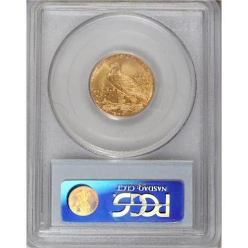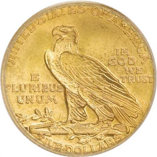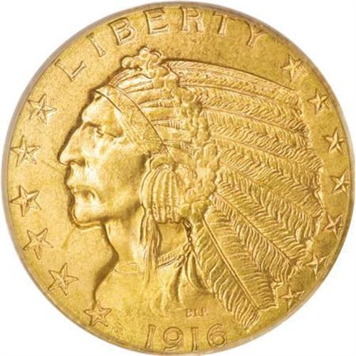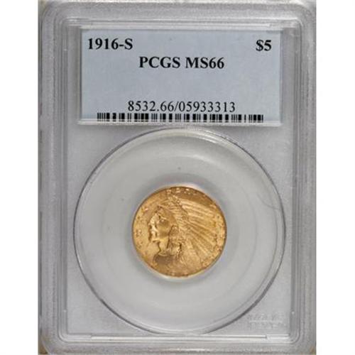 <B>1916-S $5 MS66 PCGS.</B></I> As the authors of the Garrett-Guth <I>Gold Encyclopedia </B></I>point out, the 1916-S is an issue that was saved in an original hoard of several hundred Mint State pieces when it came out, and today it is in the midrange of the series in terms of rarity. Looking at the PCGS certified population in terms of the numbers of Gems certified, it becomes obvious that several dates--1908, 1908-S, 1909, 1909-D, and the P-mint issues from 1911 through 1915--have several dozen survivors each in MS65.<BR> At the Premium Gem (MS66) level, however, the equation changes remarkably. While PCGS has certified more than 640 Indian Head half eagles in MS65, in MS66 that number drops to 55 coins for the entire series--a decrease by more than an order of magnitude. And among S-mint issues, while the 1916-S actually shows more Gem survivors than any other issue save for the first-year 1908-S, in MS66 the number of 1916-S coins so certified plummets to three pieces, making it appear that the finest pieces from that hoard were several MS65 coins and an MS66 or two. <BR> While we cannot pinpoint the source of this coin, in the final essence it little matters. What does matter is its remarkable state of preservation, a piece that has been lovingly and carefully stored for many decades. The only contact mark visible is a small scrape in the field before the Indian. The Indian's cheek is free of even the smallest abrasions, and elsewhere, for example on the highpoints of the eagle's wings and breast, there are similarly no mentionable impairments.<BR> The surfaces are a light khaki-gold, and radiant luster issues forth from each side, much deeper and more intense than normally seen on this type coin. A memorable coin for a fine date or type set, and one tied with two other coins at PCGS as the finest of the issue (7/07). <BR><BR><B>Coin Engraver:</B> Bela Lyon Pratt<BR><BR><b>Shipping:</b> Coins & Currency (<a target="_blank" href="http://www.heritageauctions.com/common/shipping.php">view shipping information</a>\)
