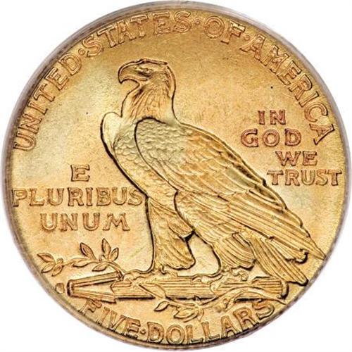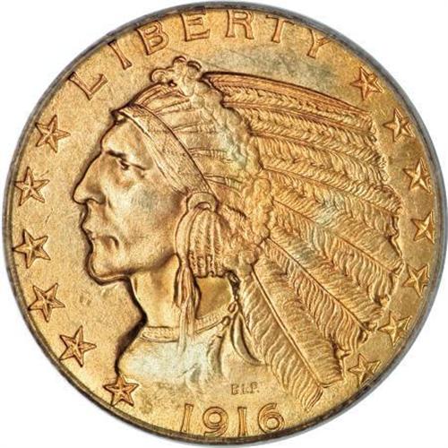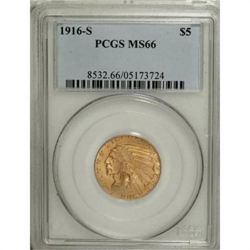 <B>1916-S $5 MS66 PCGS.</B></I> With the buildup to the Great War and the beginning of hostilities, international trade stilled, and the United States, despite its professed neutrality at the start, experienced its own consequences. As demand for American gold coinage dwindled, so did total mintages for various denominations. For half eagles, production across all mints stayed nearly steady from 1914 to 1915, but only San Francisco struck five dollar gold pieces in 1916, and its mintage of 240,000 pieces was less than a third of the previous year's total. The half eagle was also the last denomination to resume production, with the isolated issue of 1929 acting as both its return and its farewell.<BR> Despite its low mintage, the 1916-S is available for a price in lesser Mint State grades; Garrett and Guth (2006) allude to a hoard of hundreds of examples. Better representatives, however, prove elusive as always, and while even Gems command only a minor premium over type, MS66 coins are highly coveted and in exceedingly short supply. NGC and PCGS have graded only five such pieces, with none finer in the combined certified population (11/07).<BR> The coloration of this outstanding exemplar is its most striking feature, with warm orange-gold surfaces that shift to sun-yellow and rose at parts of the margins. The devices are sharply struck, and the only softness is present on the mintmark. Though a handful of tiny flaws are evident, the overall preservation of this piece is magnificent, and the eye appeal is simply marvelous. Though Heritage has offered this issue in the past, it is impossible to say when an opportunity to acquire an MS66 representative may come again.<BR><BR><B>Coin Engraver:</B> Bela Lyon Pratt<BR><BR><b>Shipping:</b> Coins & Currency (<a target="_blank" href="http://www.heritageauctions.com/common/shipping.php">view shipping information</a>)