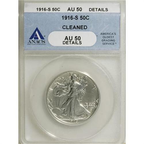 <B>1916-S 50C --Cleaned--ANACS. AU50 Details.</B></I> NGC Census: (3/412). PCGS Population (12/637). Mintage: 508,000. Numismedia Wsl. Price for NGC/PCGS coin in AU50: $650. (#6568)<BR><BR><B>Coin Engraver:</B> Adolph A. Weinman<BR><BR><b>Shipping:</b> Coins & Currency (<a target="_blank" href="http://www.heritageauctions.com/common/shipping.php">view shipping information</a>)