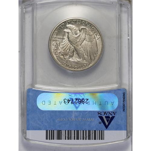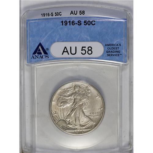 <B>1916-S<50C> AU58 ANACS.</B></I> A beautiful matte-like texture encompasses each side of this first-year example. Well struck with only traces of highpoint wear to indicate AU status. By far the most difficult of the 1916 Walking Liberty issues.